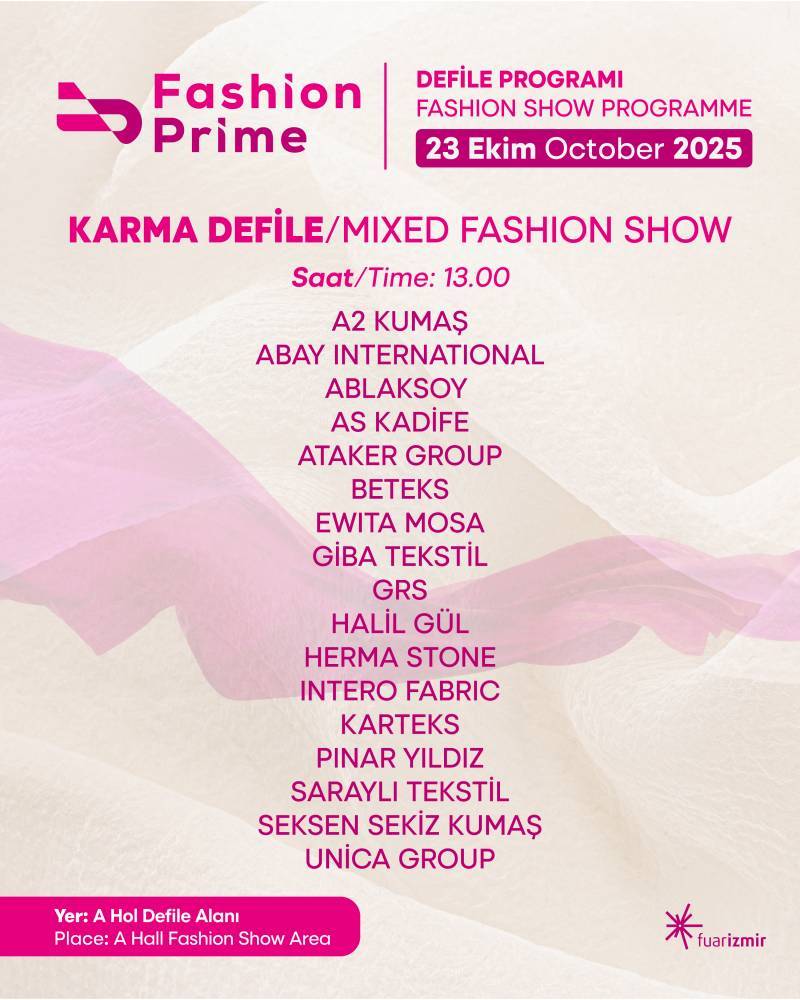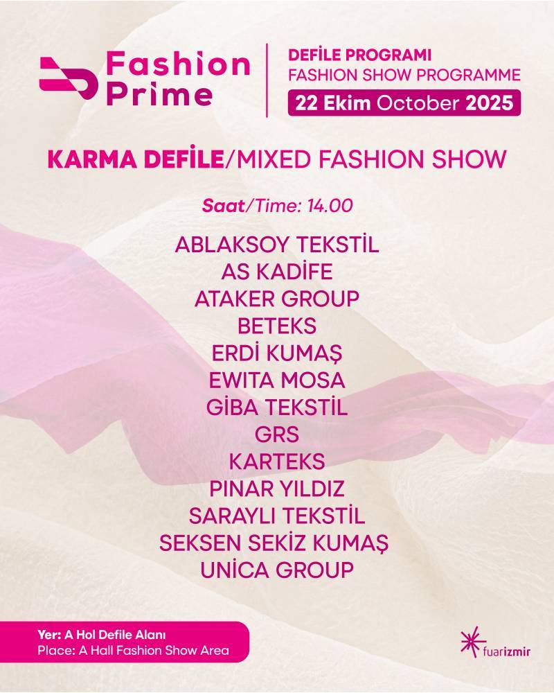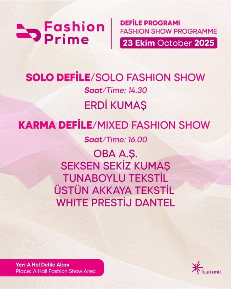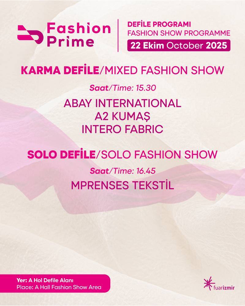 İzmir Büyükşehir Belediyesi ev sahipliğinde İZFAŞ tarafından sekizincisi organize edilecek olan FASHION PRIME Tekstil, Hazır Giyim Tedarikçileri ve Teknolojileri Fuarı; 22-24 Ekim 2025 tarihleri arasında Türkiye’nin en büyük ve en modern fuar merkezi Fuarizmir’de kapılarını açmaya hazırlanıyor.